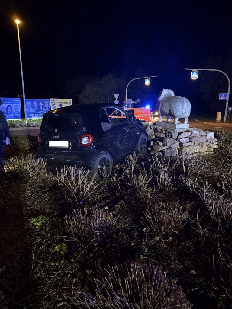 Der Fahrer kam von der Fahrbahn ab und kollidierte auf dem Kreisel neben der Tankstelle mit einer Statue.